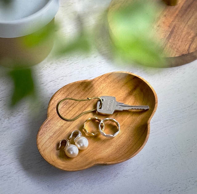 手触りが良く高級感のあるチークウッドで作ったふんわり和モダンなお花型のプレート。 小物だけではなくお茶菓子入れにも使えます。