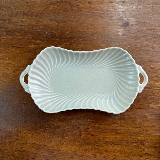 波のようなレリーフが釉薬に浮かび上がり華やかに見えるプレート。 持ち手がついてる事で特別感がプラス。 color ⇨ブルーグレー size ⇨ w260(227)㎜/ d139㎜/ h30㎜