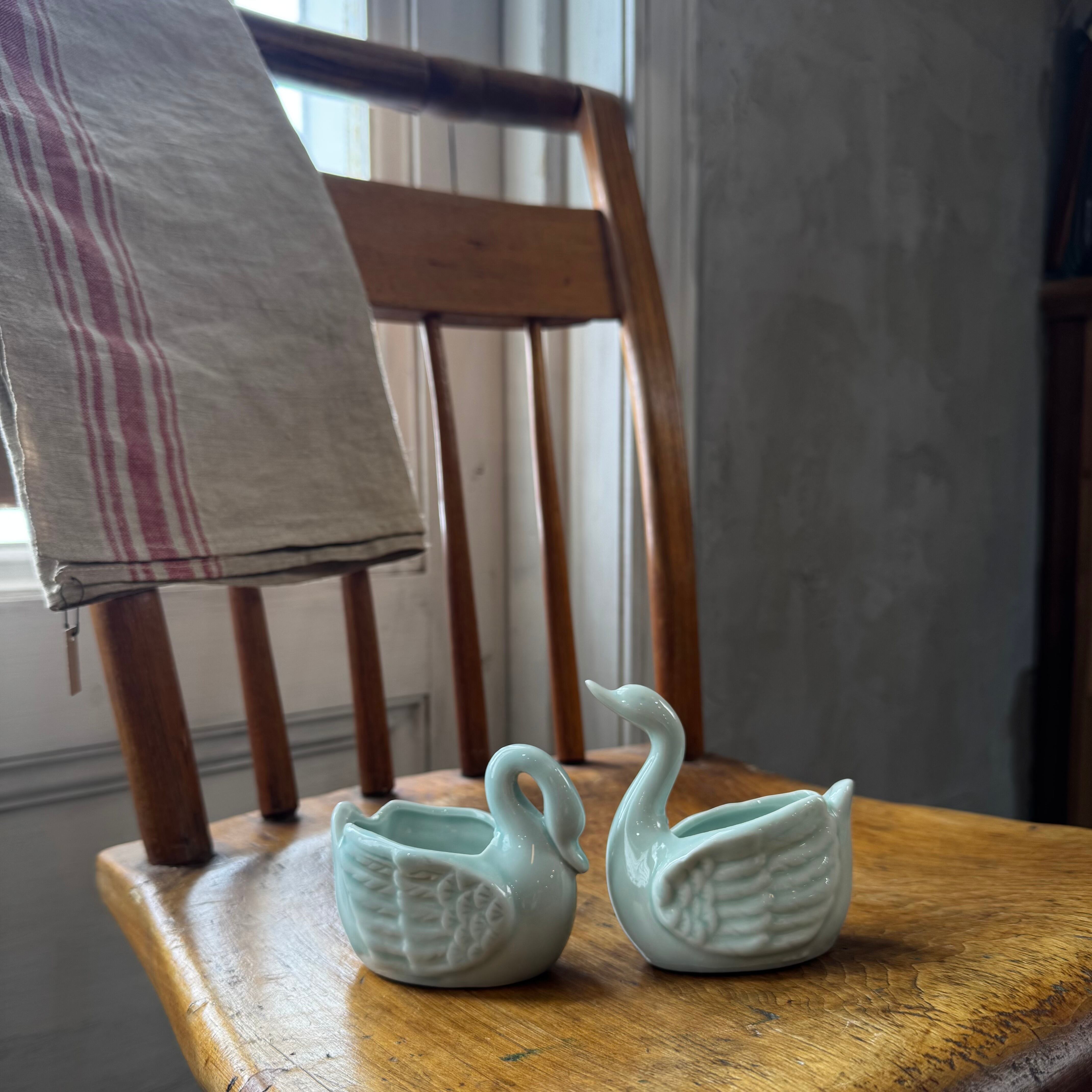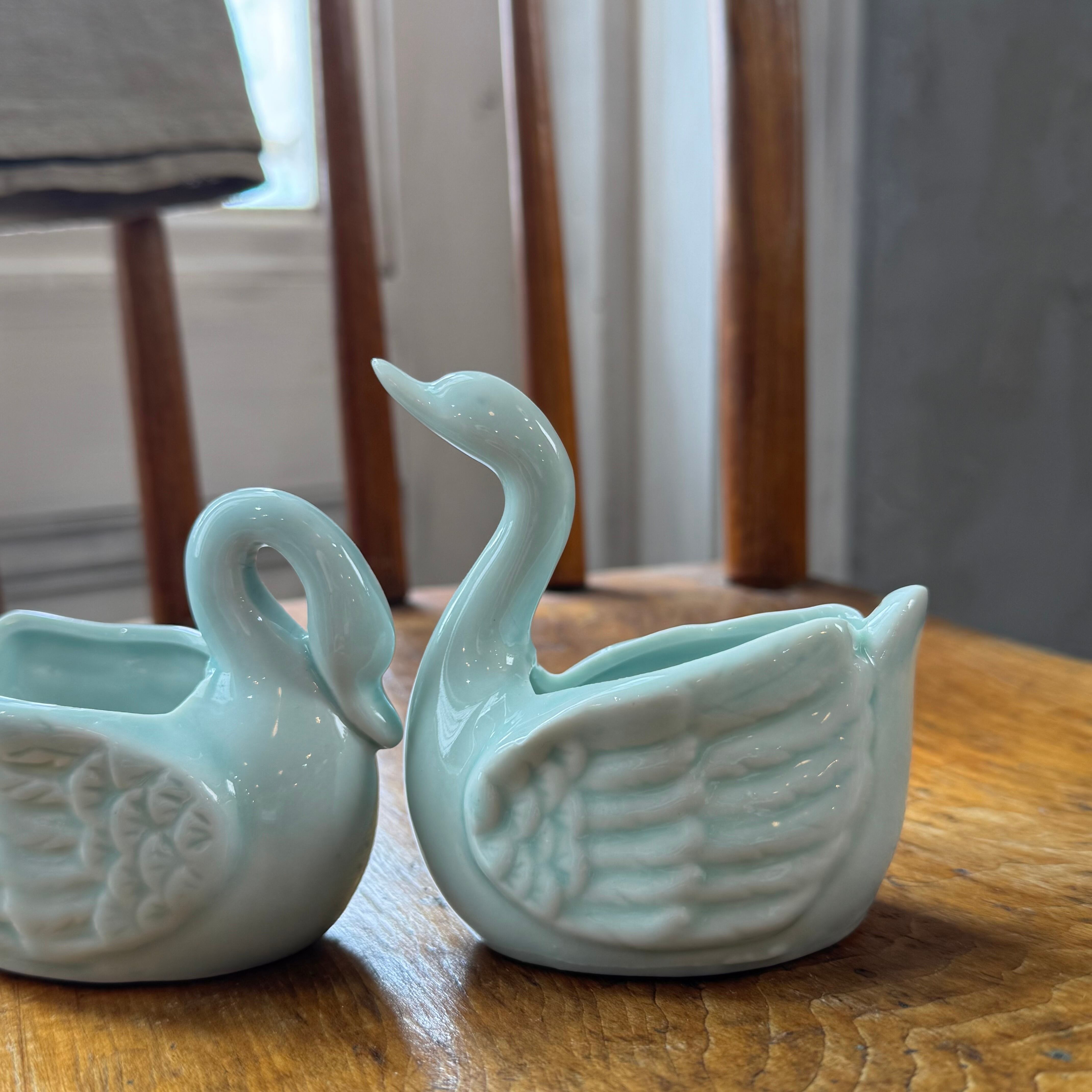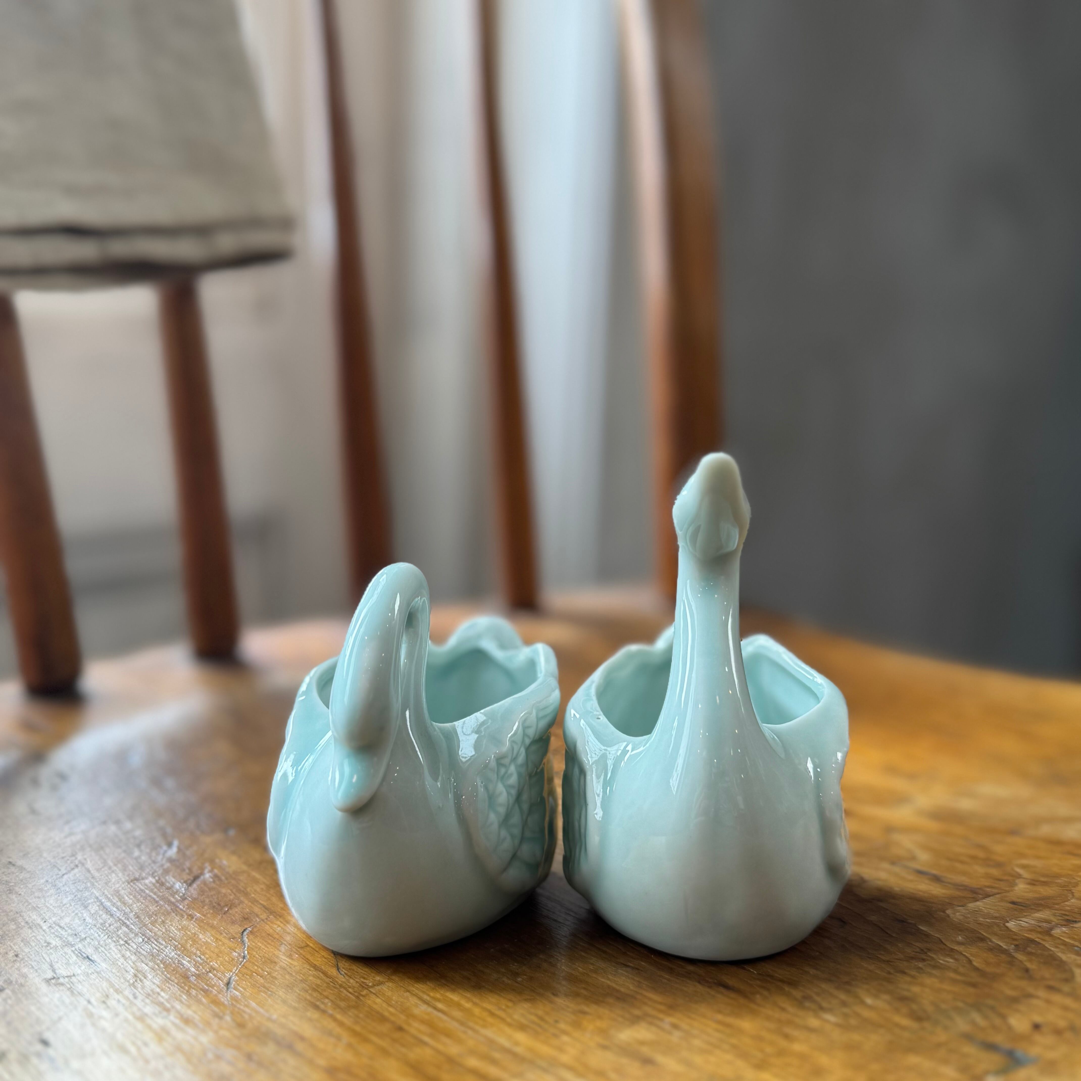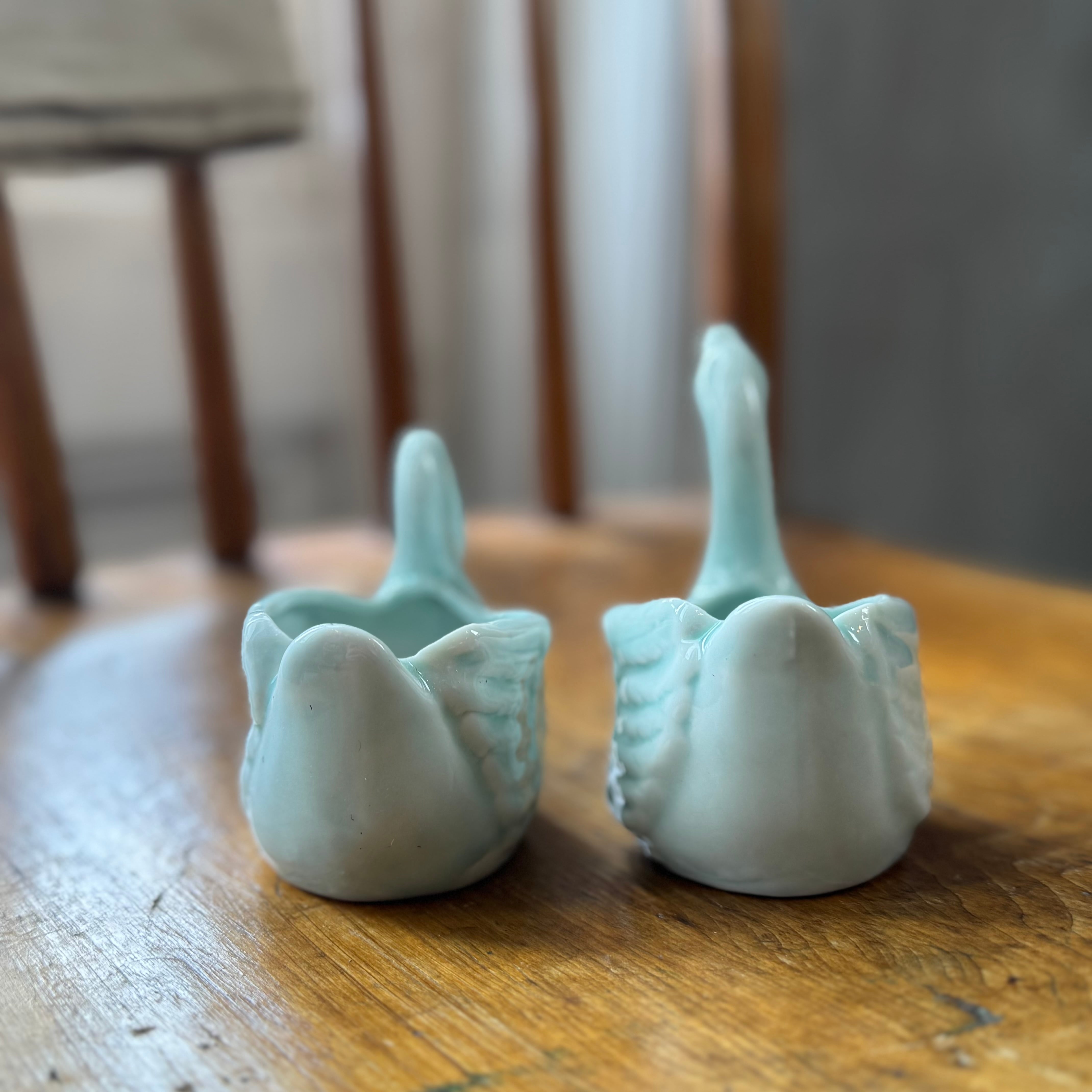 淡い青磁色が上品な、白鳥モチーフの陶器製ミニポット。