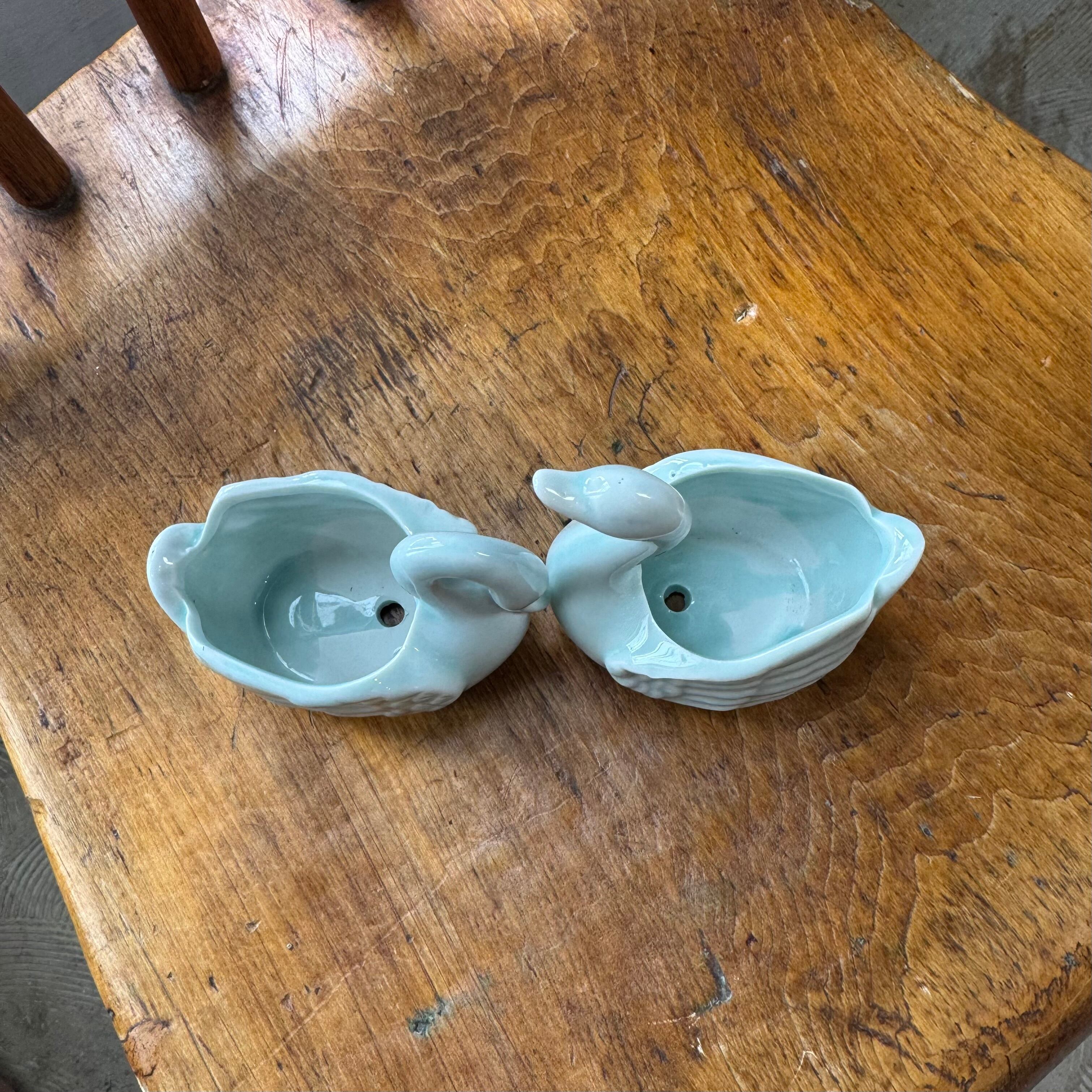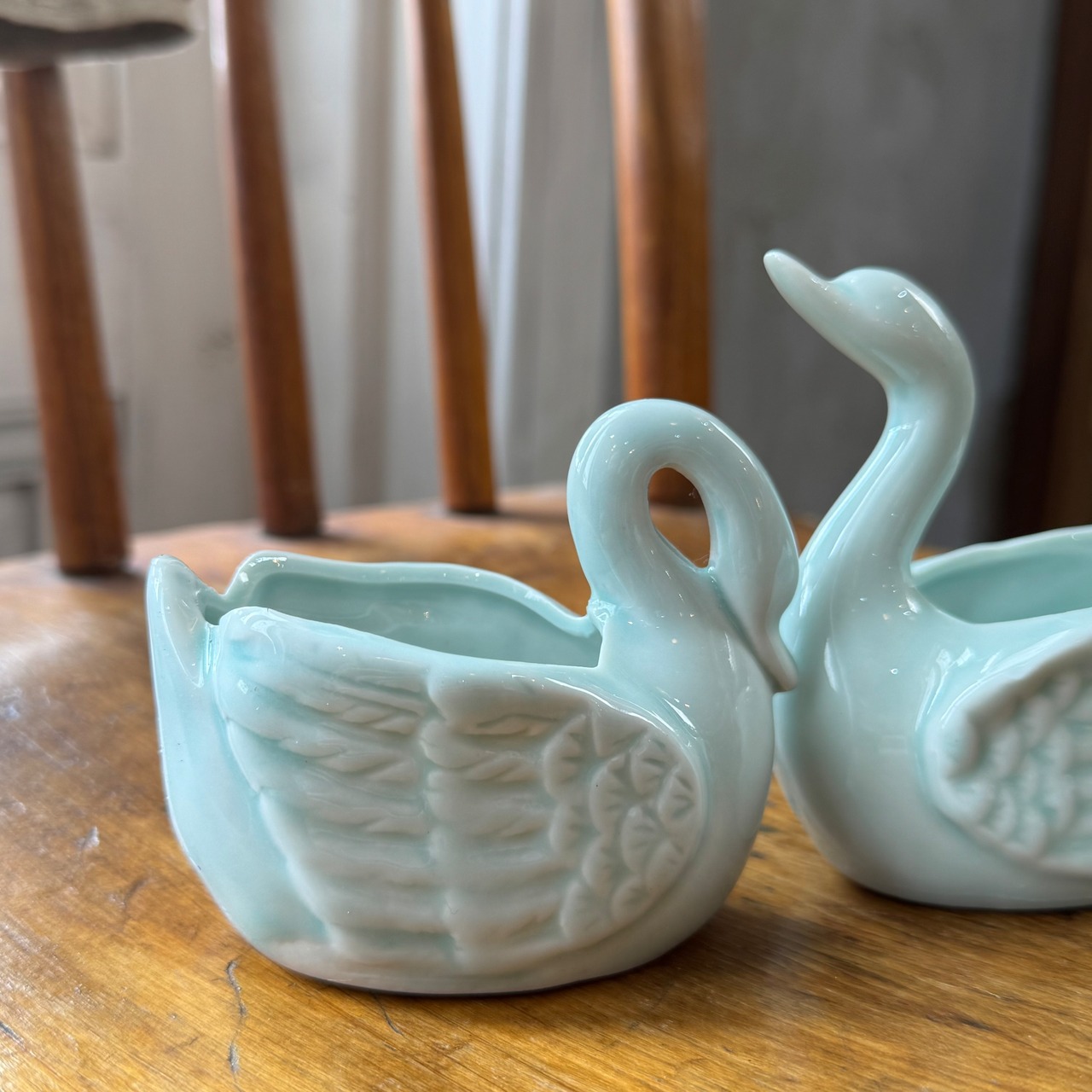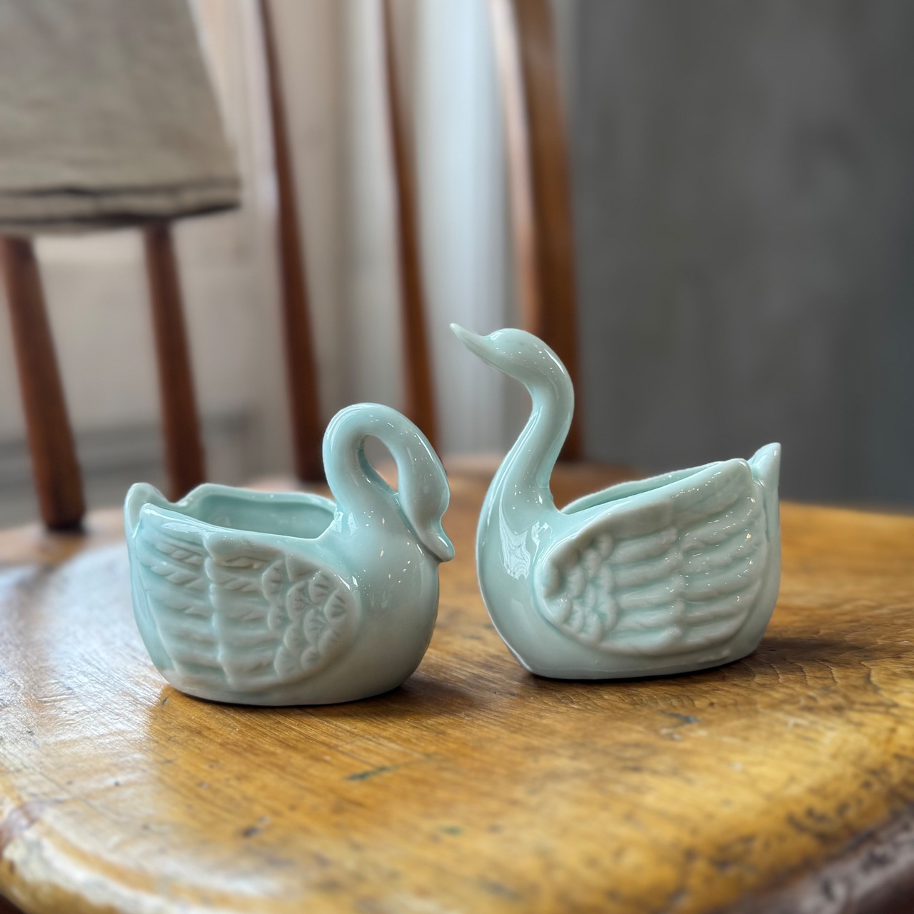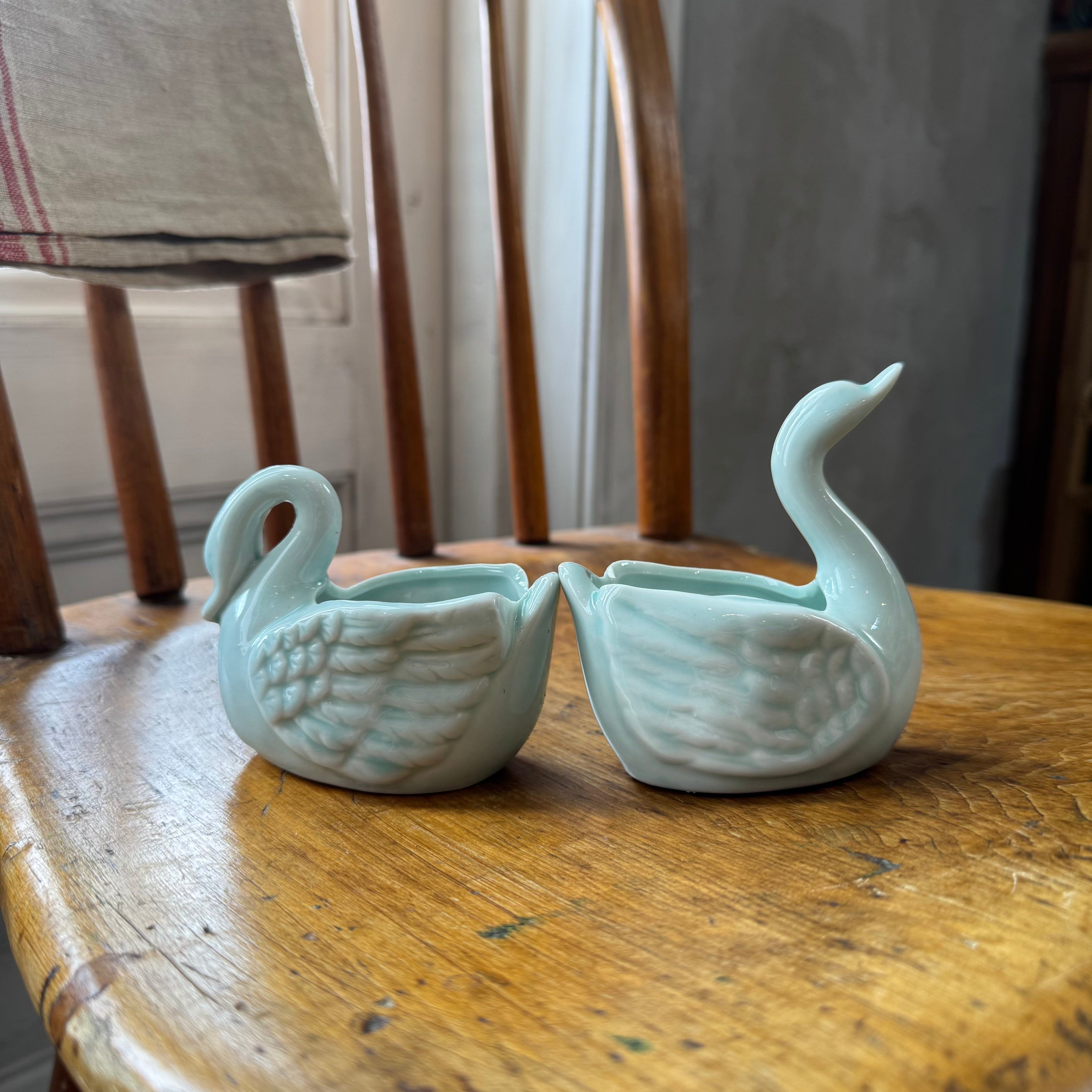 淡い青磁色が上品な、白鳥モチーフの陶器製ミニポット。