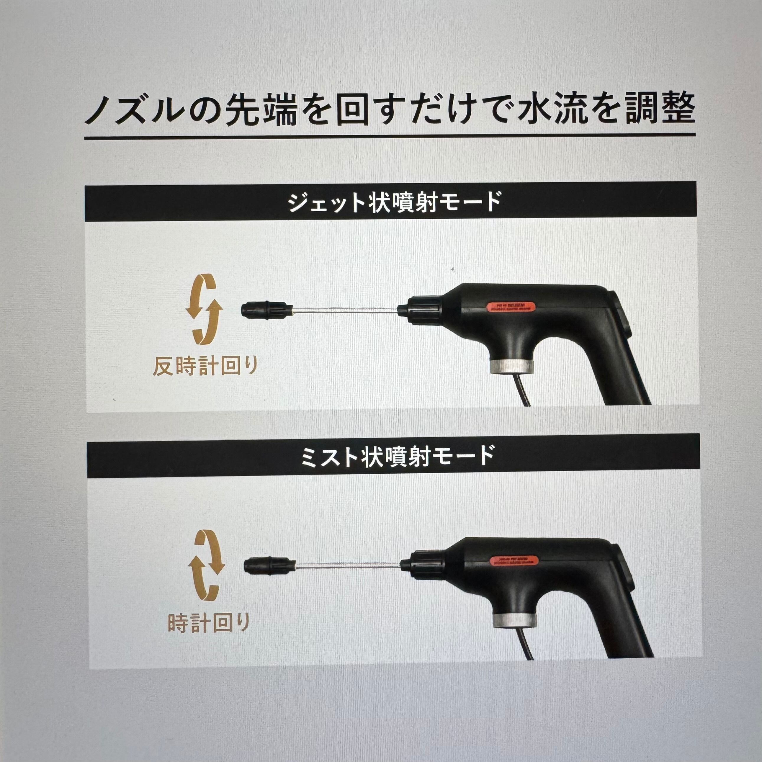 ノズルの先端を回すだけの簡単な操作で、ジェット状噴射・ミスト状の噴霧の水流調整が可