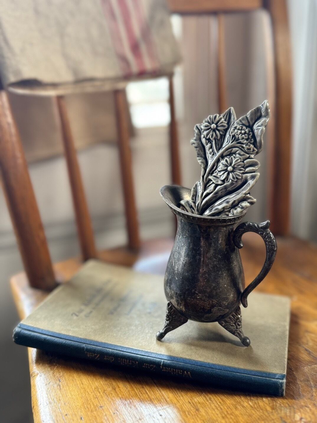 ピューターの小さなフラワーベースにそっと立てれば、まるで草花を活けたようなまいに。
